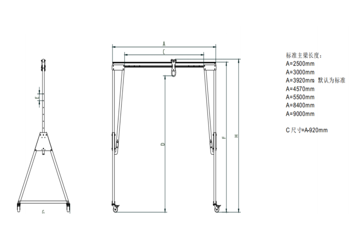 Det er to hovedtyper av små løfteportaler: den ene er en fullt mobil portal med bremsede bærende hjul, egnet for løfting på bakkenivå. Den andre er en fast portal montert på skinner på et gulv eller en bjelke, ved hjelp av en elektrisk eller manuell talje for mekanisert løfting. Dette reduserer arbeidskraft, reduserer produksjons- og driftskostnader og forbedrer arbeidseffektiviteten. Vårt firma kan tilpasse produkter basert på kundens krav til nettstedet. Mobile portaltaljer kan utstyres med enten en håndkjettingtalje eller en elektrisk kjettingtalje, og tilbyr høy praktisk funksjon og utprøvd teknologi, noe som gjør dem svært populære blant produsenter.